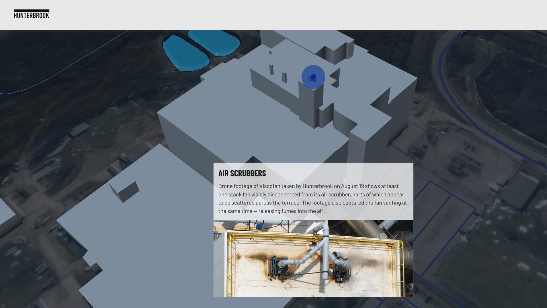 Custom 3D interactive map crystallizing investigative journalism about Viscofan's toxic pollution in Danville, Illinois—visually beautiful immersive storytelling that moved markets.