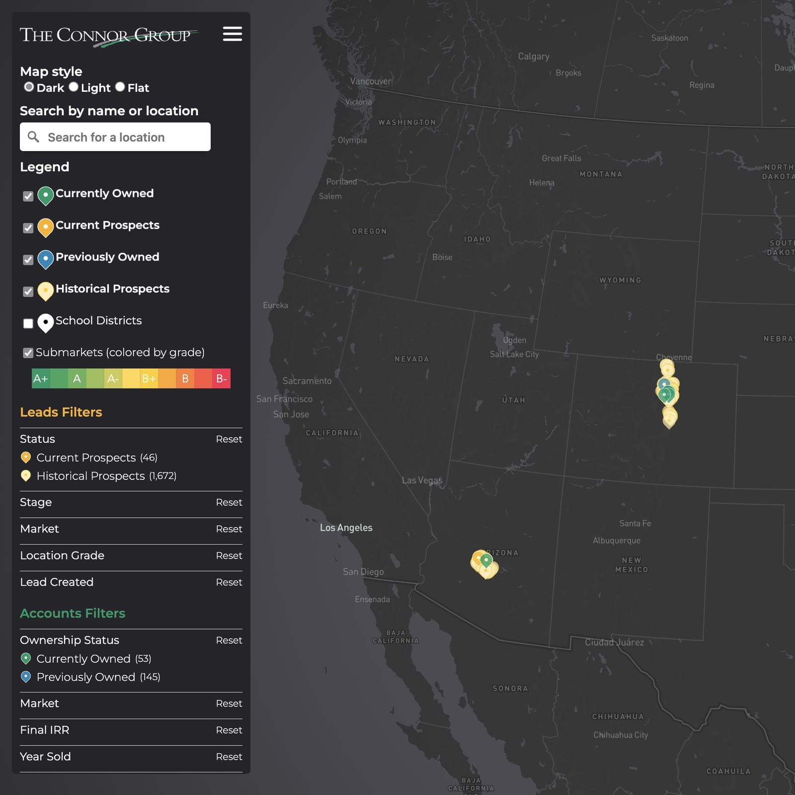 To support acquisition analysis, we researched and procured custom demographic layers and helped build a classification system for choropleth mapping that indexes lead quality down to the school district level using a letter-grade system. Combined with elevation data and high-resolution satellite imagery, the platform enables The Connor Group to identify promising locations nationwide. The interface includes bespoke filtering by attributes, multiple layer controls with impeccable UX, custom branding, and multiple map styles. Users can analyze potential portfolio additions and deliver custom-curated decks and animations of filtered property lists for consideration.