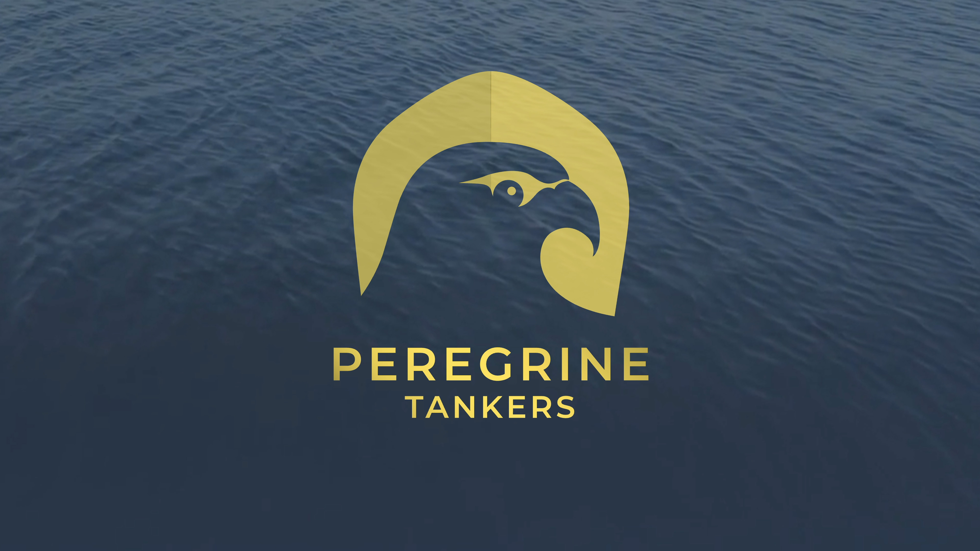 Above: Peregrine Tankers brand crest integrating ship bow, wave, and falcon profiles; Deep blue and nautical yellow color palette; Custom global shipping tanker animation; Corporate materials suite including presentation templates.