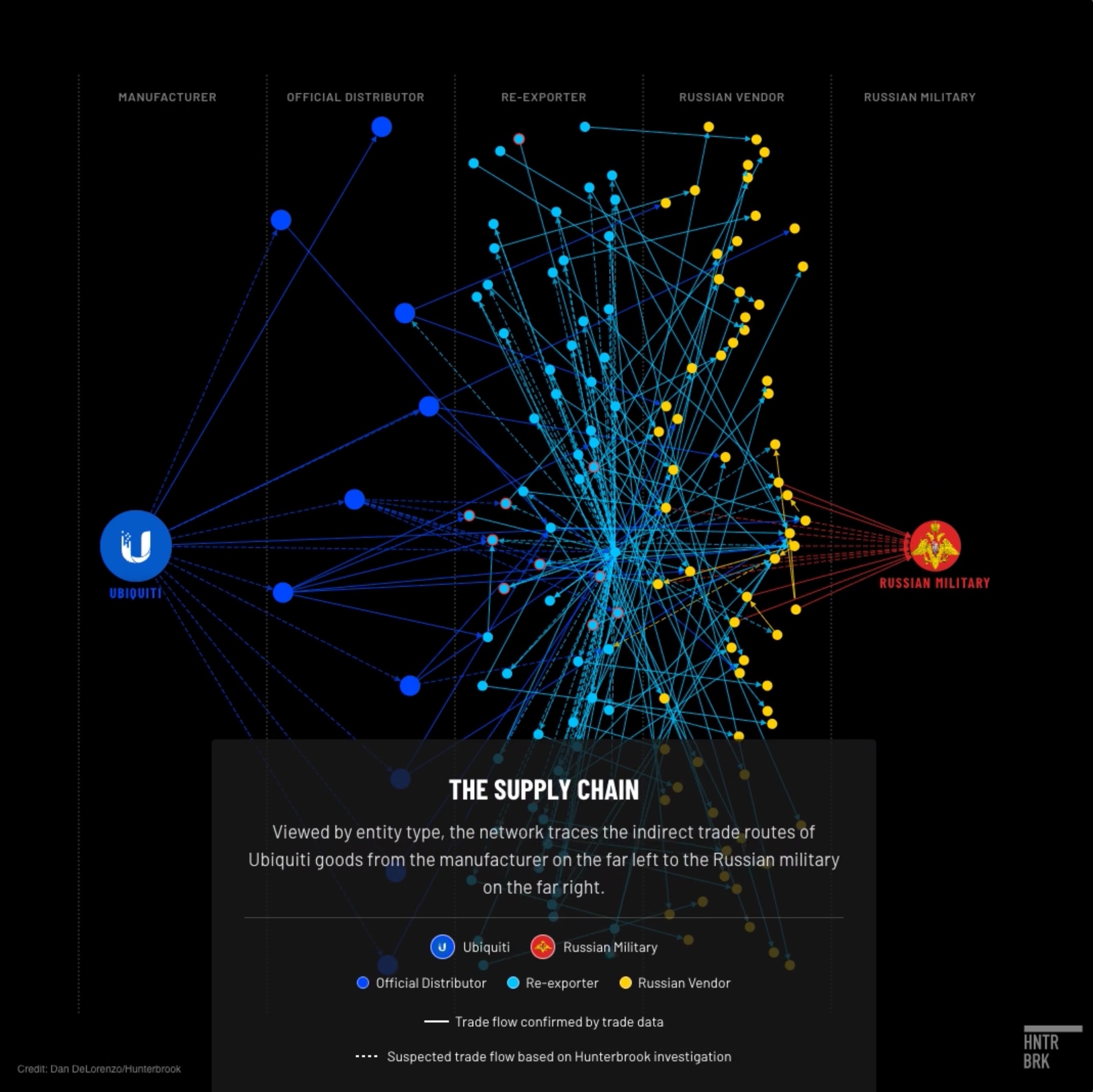 Hunterbrook came to us with a bird's nest — months of exhaustive research tracing how Ubiquiti networking equipment reaches Russian military drone operations despite U.S. sanctions. The data was all there: distributors, shell companies, transshipment routes through Turkey and Kazakhstan. Our job was to make it legible.