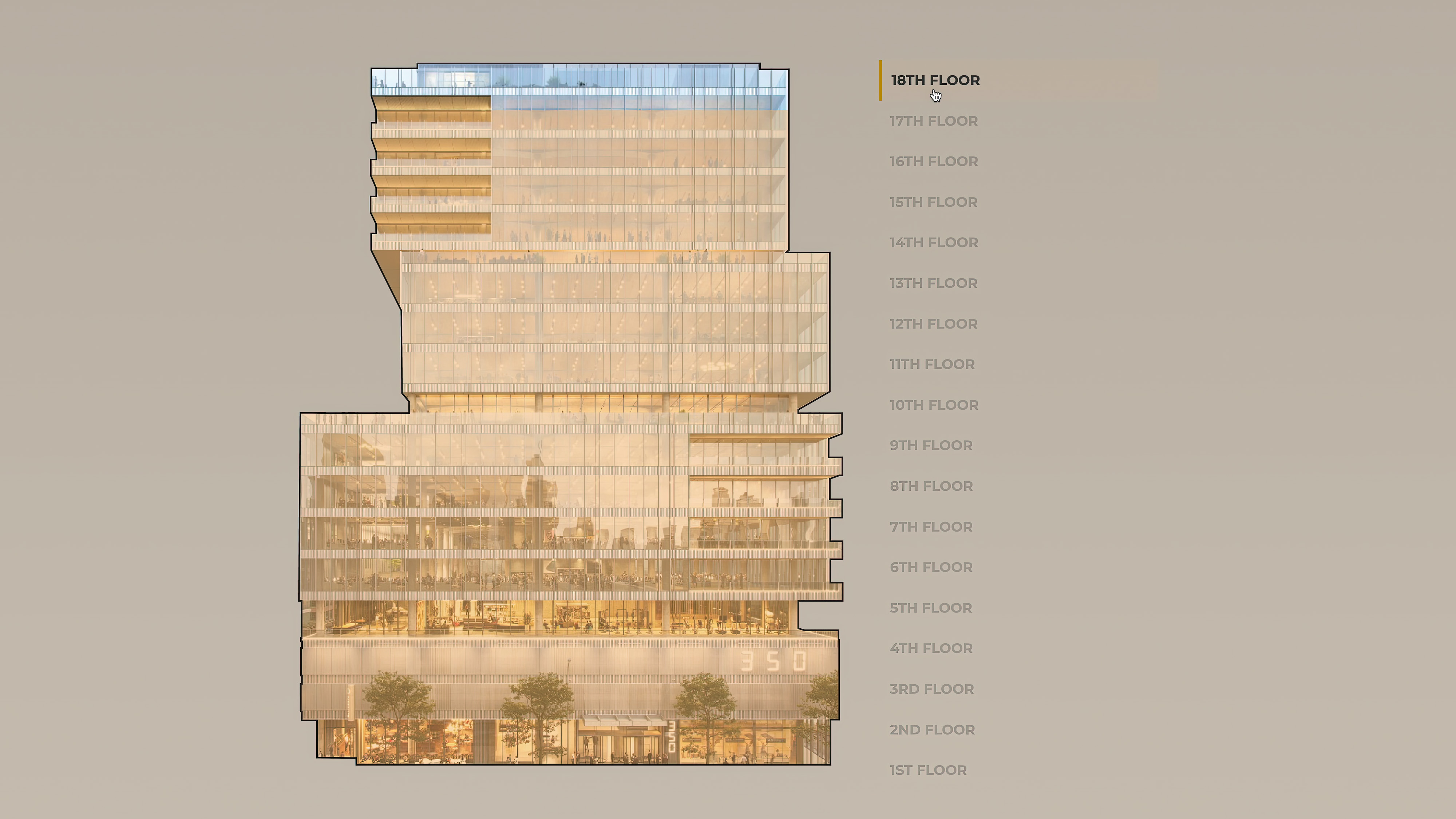Custom floor-by-floor navigation tools for Class A office properties, enabling prospective tenants to explore available suites through branded interactive experiences that integrate with client CMS systems.